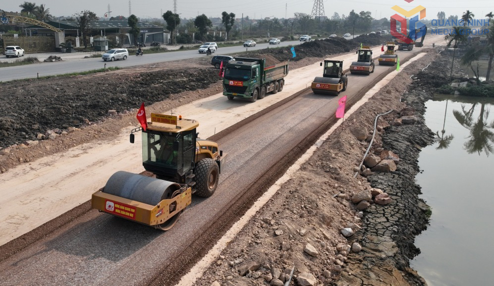 Thi công cấp phối nền đường tại Dự án đường ven sông (đoạn từ tỉnh lộ 338 đến khu vực Đông Triều) trong mùng 4 Tết Nguyên đán Bính Ngọ 2026.