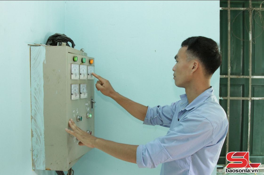 Kỹ thuật viên trạm cấp nước Tông Cọ - Nong Lay, xã Chiềng La kiểm tra áp lực nước tại trạm bơm.
