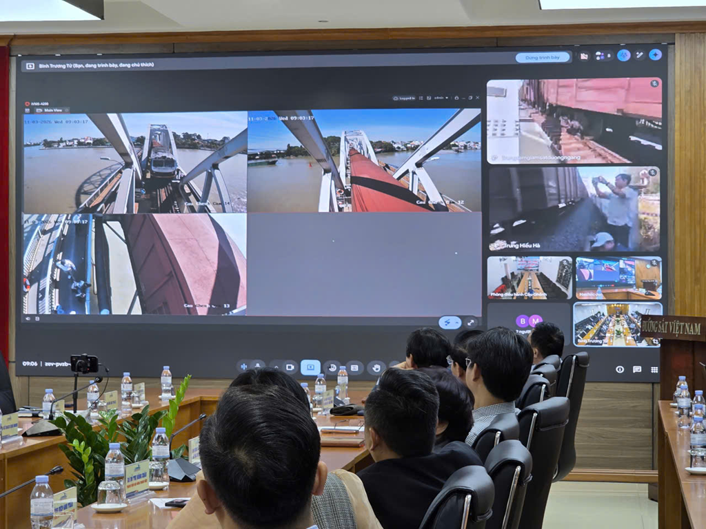 Tại Trung tâm chỉ huy xử lý tình huống khẩn cấp, các đại biểu theo dõi lễ thông tàu cầu Ghềnh, hình ảnh tàu qua cầu từ nhiều vị trí, trong đó có vị trí nhịp dầm gia cố.