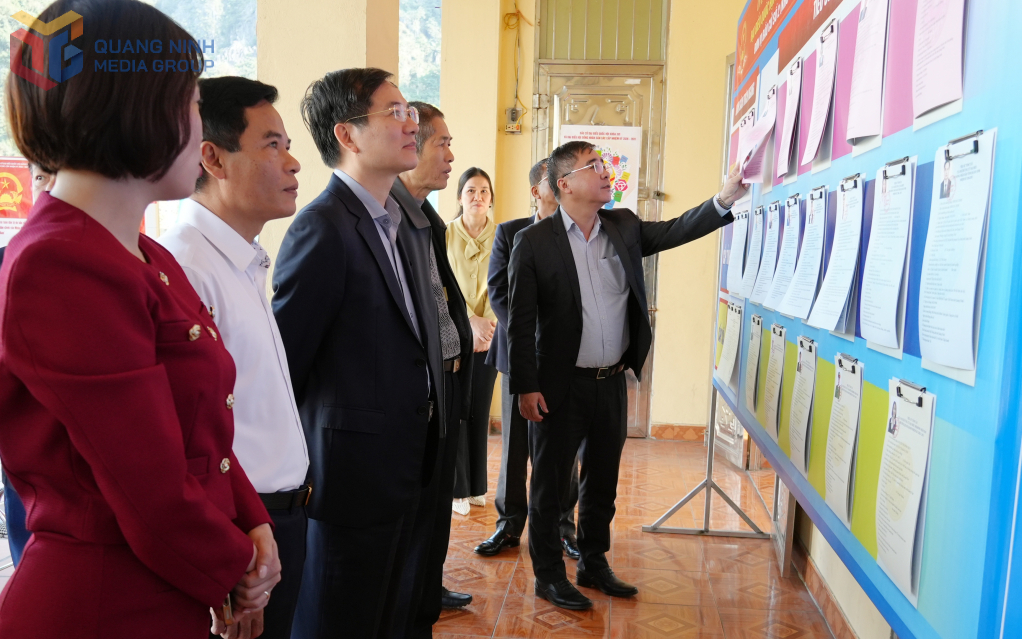 Đồng chí Phó Bí thư Tỉnh ủy, Chủ tịch Ủy ban MTTQ Việt Nam tỉnh kiểm tra khu vực niêm yết danh sách người ứng cử tại khu vực bỏ phiếu số 2 (khu phố 4A) - phường Quang Hanh.