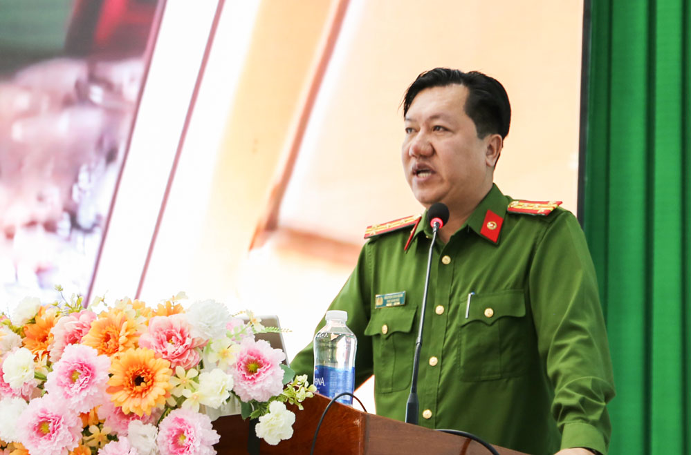 Đại tá Nguyễn Văn Hạnh - Phó Giám đốc Công an tỉnh tuyên truyền về đảm bảo an ninh, an toàn trật tự cho cuộc bầu cử ĐBQH khóa XVI và đại biểu HĐND các cấp.