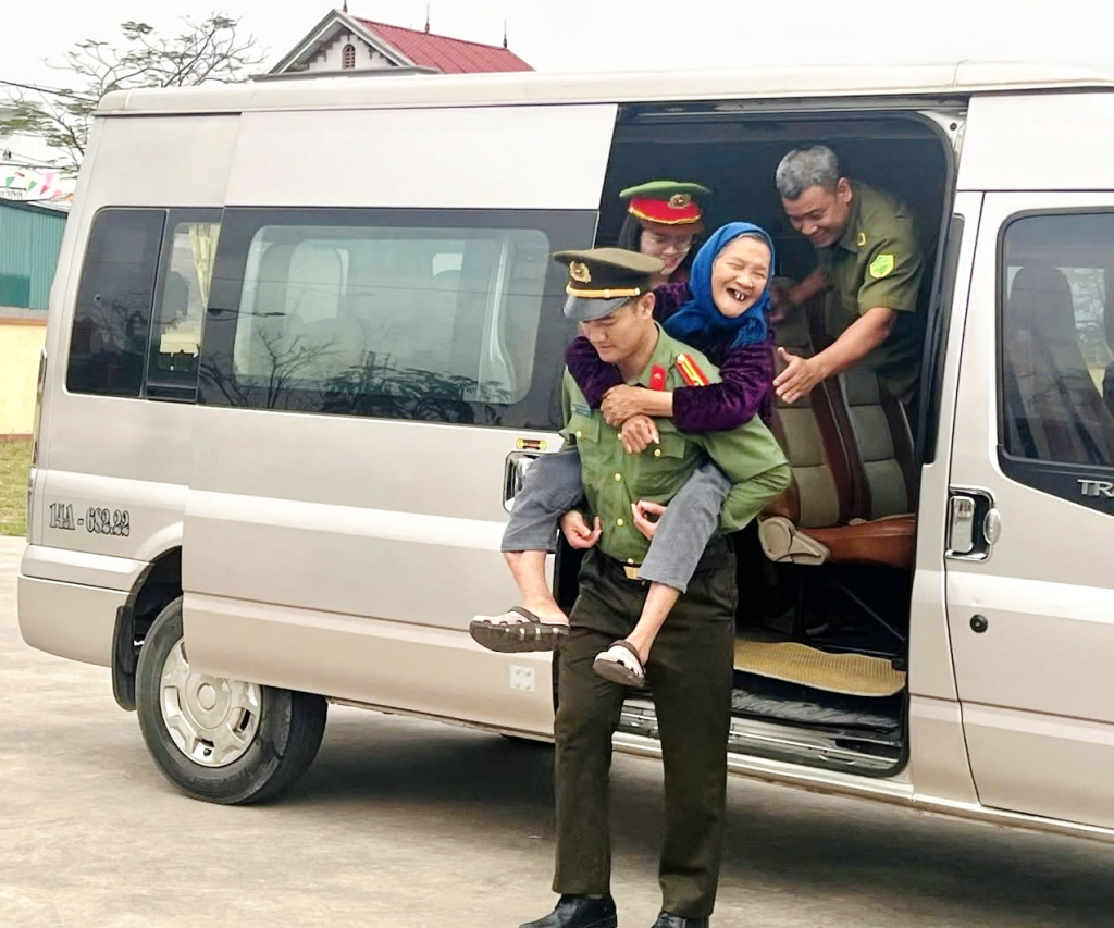 Cán bộ chiến sĩ Công an tỉnh hỗ trợ cử tri là người cao tuổi đến khu vực bỏ phiếu.