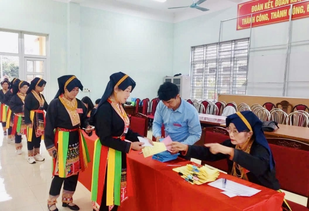 Cử tri đồng bào dân tộc thiểu số của xã Thống Nhất đi bỏ phiếu.