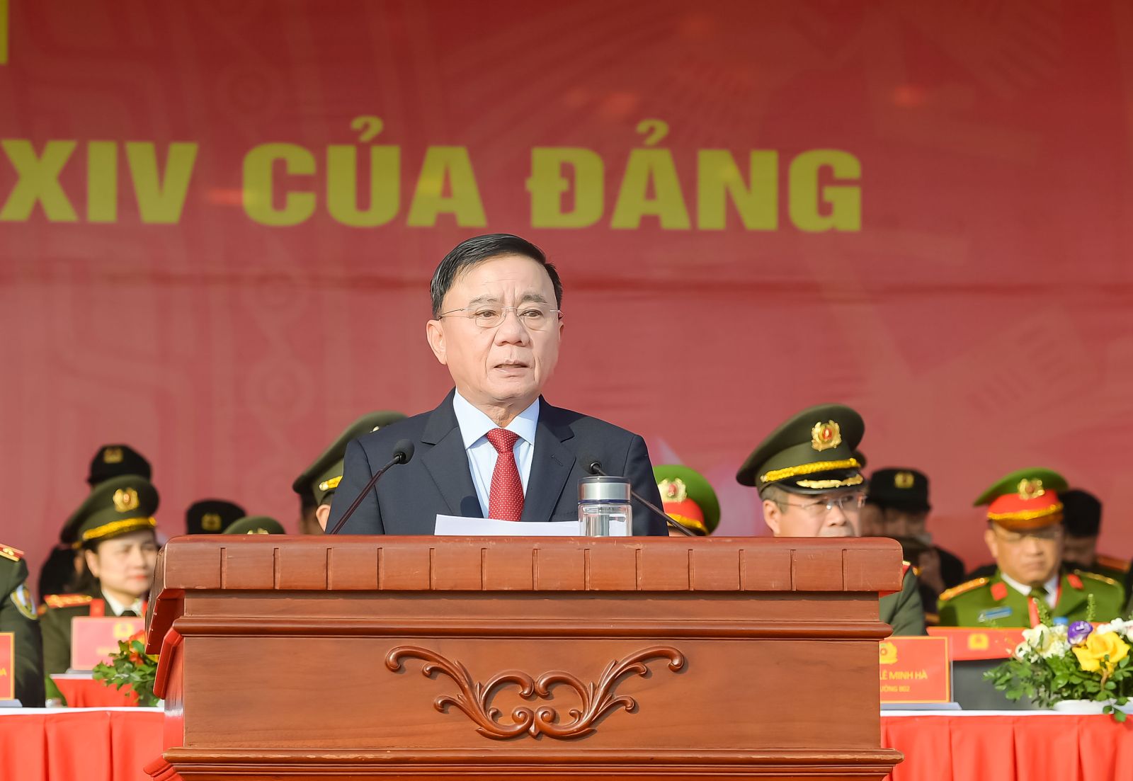 Đồng chí Thường trực Ban Bí thư Trần Cẩm Tú phát biểu chỉ đạo tại Lễ xuất quân và diễn tập phương án bảo đảm an ninh, trật tự Đại hội đại biểu toàn quốc lần thứ XIV của Đảng.