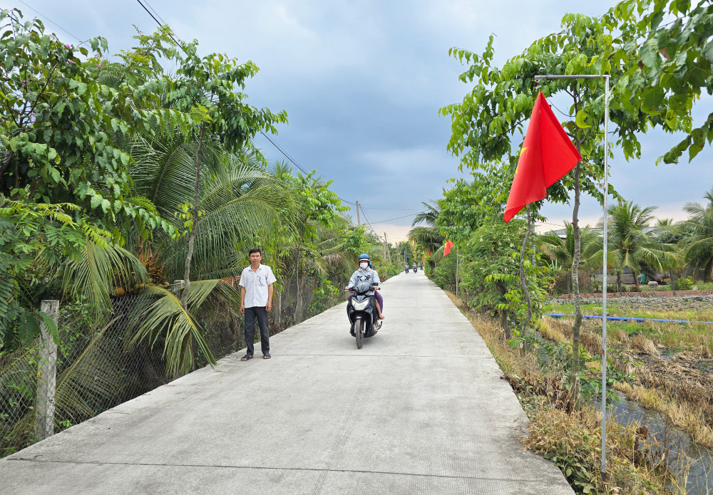 Tại ấp Bình An B, xã Lợi Bình Nhơn, từ năm 2024 đến nay đã hoàn thành 3 công trình, đưa vào sử dụng, 1 công trình đang tổ chức thực hiện. Dẫn chúng tôi đi trên một trong những con đường GTNT ở ấp Bình An B được bêtông sạch, đẹp, có trồng cây xanh, gắn đèn chiếu sáng và treo cờ Tổ quốc, Bí thư Chi bộ, Trưởng ấp Bình An B - Phan Văn Hòa không giấu được vui mừng.