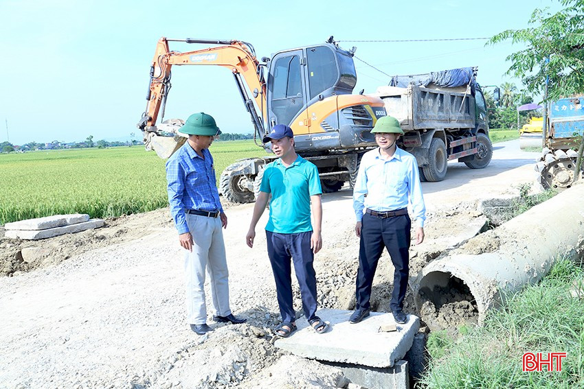 Lãnh đạo xã Thạch Lạc kiểm tra tiến độ thi công tuyến đường nội đồng từ thôn Quyết Tiến (Thạch Lạc) đến xã Thạch Trị