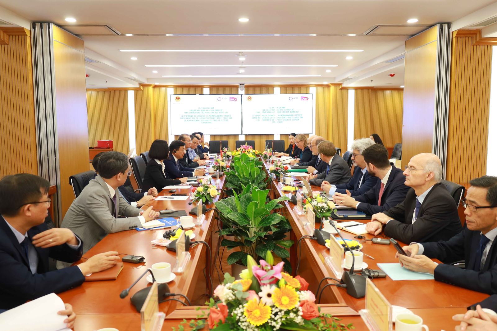 Kết thúc buổi làm việc, Thứ trưởng Bộ Xây dựng Nguyễn Danh Huy, Tổng Giám đốc AFD Remy Rioux, Chủ tịch SNCFI Diego Diaz ký kết Bản ghi nhớ giữa Bộ Xây dựng Việt Nam, Cơ quan Phát triển Pháp và Tổng công ty Quốc tế đường sắt quốc gia Pháp về tăng cường năng lực cho cán bộ quản lý của Bộ Xây dựng trong lĩnh vực đường sắt.