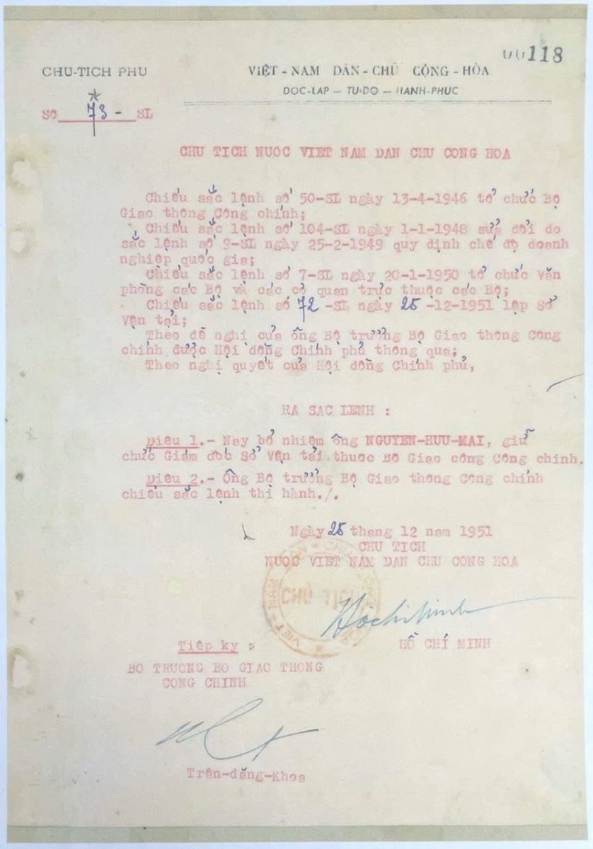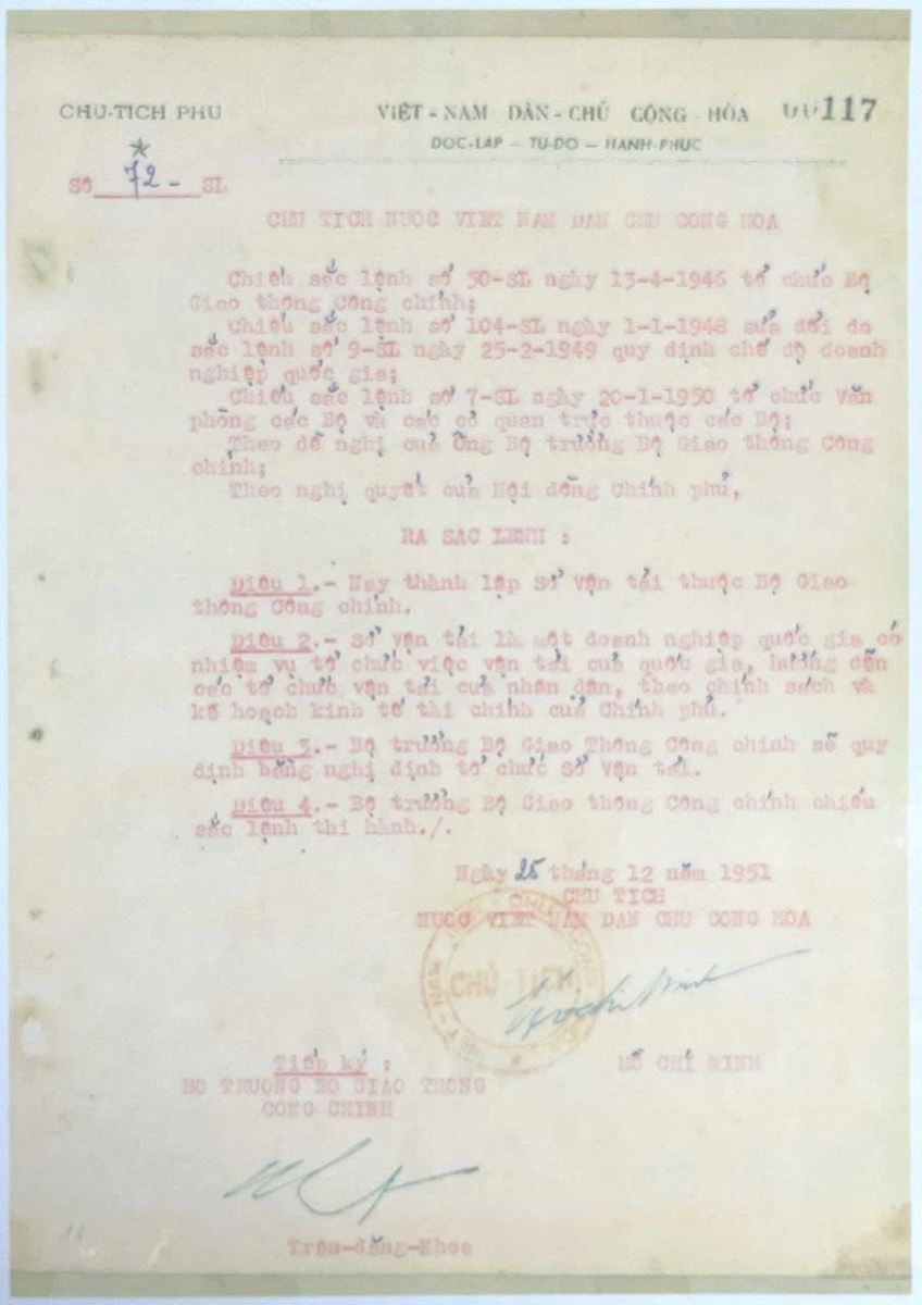 Decree No. 72/SL signed by President Ho Chi Minh established the Department of Transport under the Ministry of Transport and Public Works.