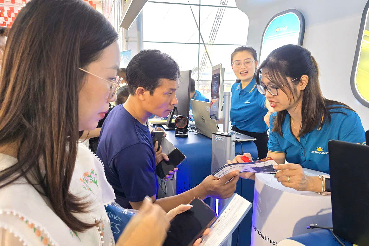 The Vietnam Airlines booth attracts a large number of visitors with a lively atmosphere offering several exciting aviation experiences, from flight simulators and virtual reality passenger cabins to business lounges.