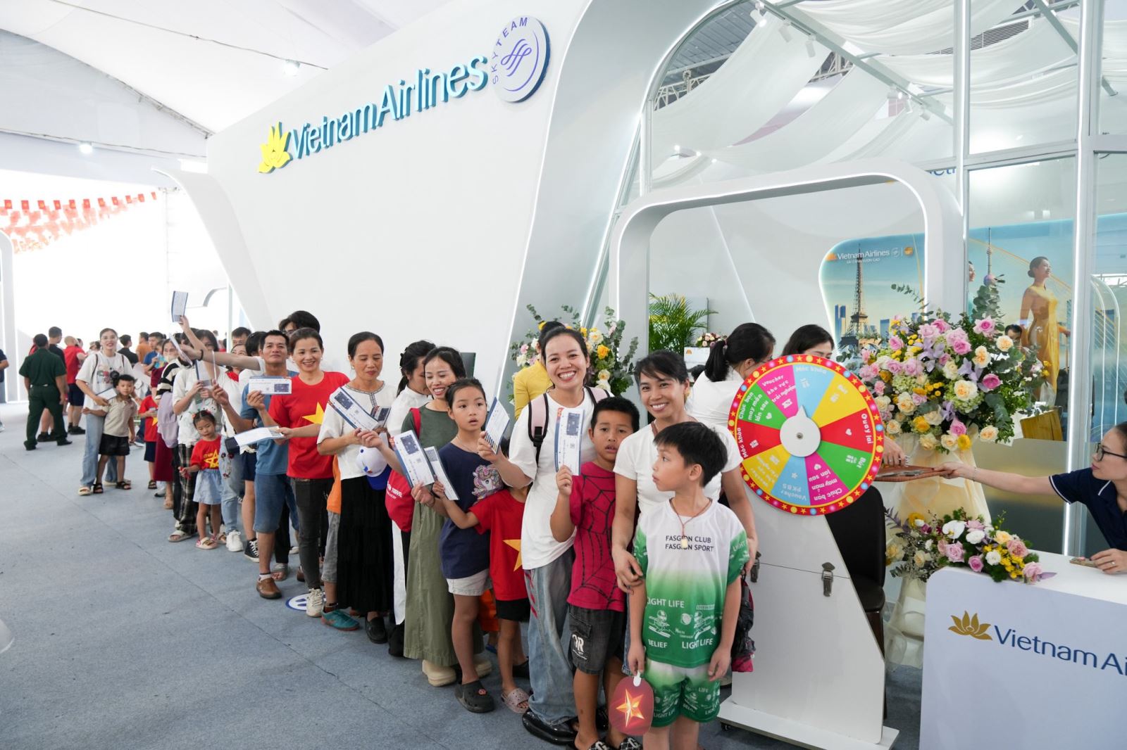 Visitors line up to experience taking a Vietnam Airlines flight at the Exhibition.