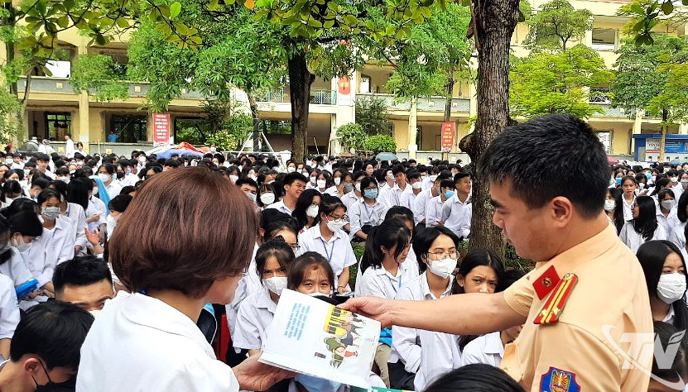 Lực lượng Cảnh sát giao thông (Công an tỉnh) tăng cường công tác tuyên truyền về bảo đảm trật tự an toàn giao thông tại các trường học.