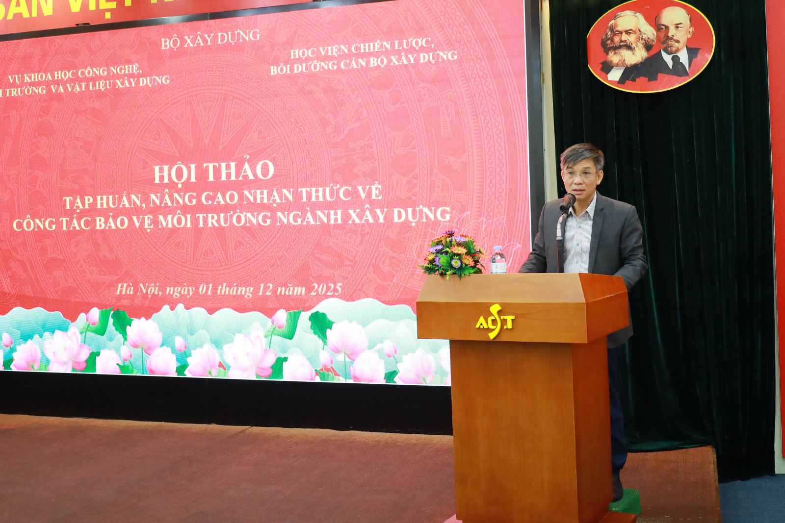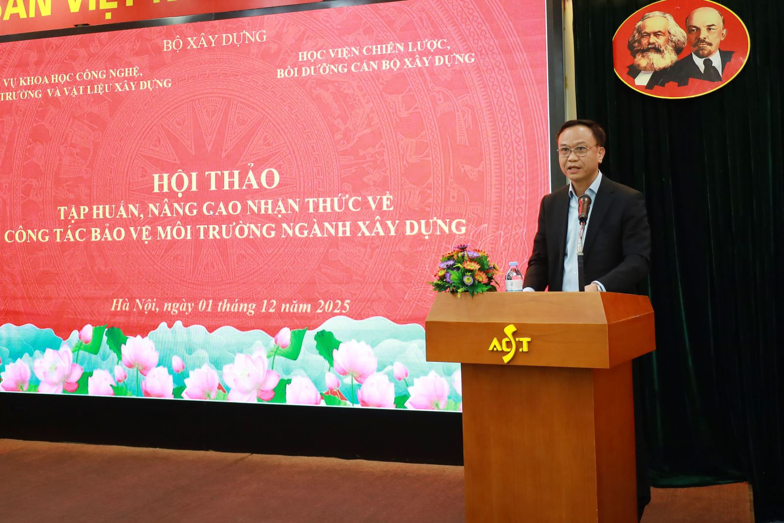 On December 1st, 2025, in Hanoi, under the assignment of the Ministry of Construction, the Department of Science, Technology, Environment and Construction Materials, in coordination with the Academy of Construction Strategy and Cadres Training, organized the workshop “Training to Raise Awareness of Environmental Protection in the Construction Sector” with the participation of representatives of agencies and units under the Ministry of Construction; provincial Departments of Construction; facilities required to conduct greenhouse gas inventories in the transport and construction sectors; project management boards; manufacturing enterprises; professional associations; and specialized institutes and universities.