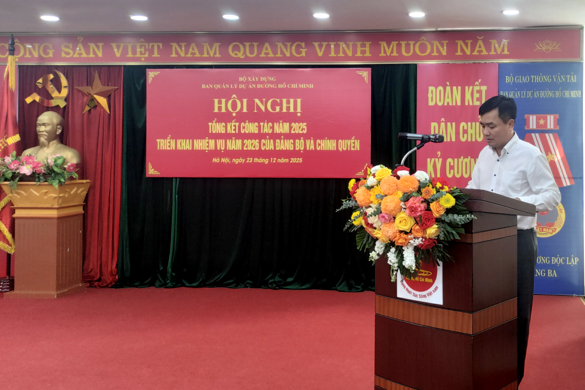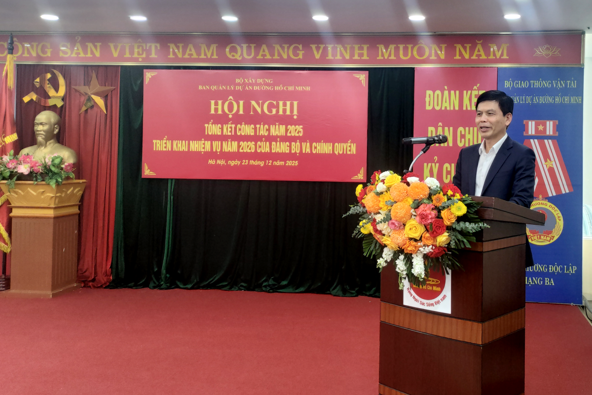 Chiều ngày 23/12, Ban Quản lý dự án đường Hồ Chí Minh đã tổ chức tổng kết công tác năm 2025 và triển khai phương hướng nhiệm vụ công tác năm 2026. Thứ trưởng Bộ Xây dựng Lê Anh Tuấn đã tới dự và phát biểu chỉ đạo.