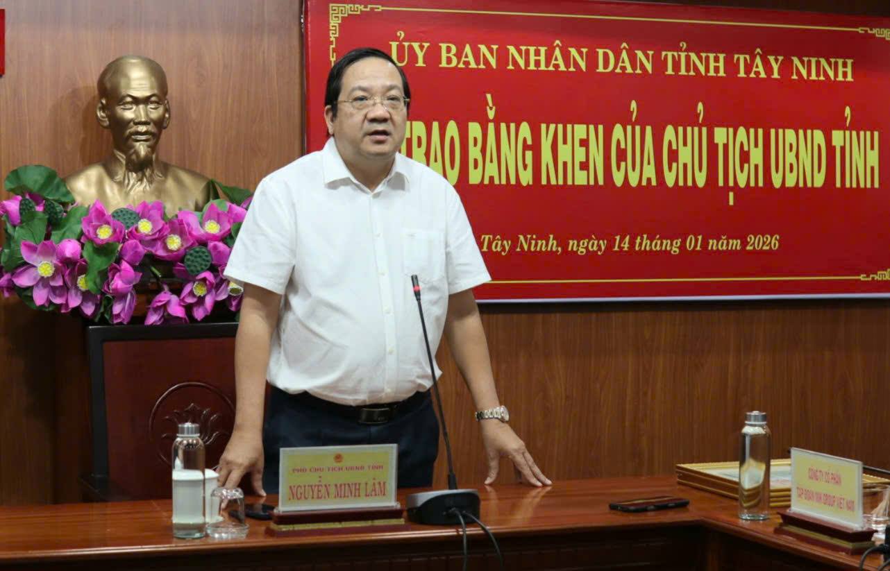 Chiều 14/1/2026, Phó Chủ tịch UBND tỉnh Tây Ninh Nguyễn Minh Lâm chủ trì buổi Lễ trao Bằng khen của Chủ tịch UBND tỉnh nhằm biểu dương các tập thể và cá nhân có thành tích xuất sắc trong quá trình thực hiện công tác chuẩn bị đầu tư Dự án đường Vành đai 4 thành phố Hồ Chí Minh.