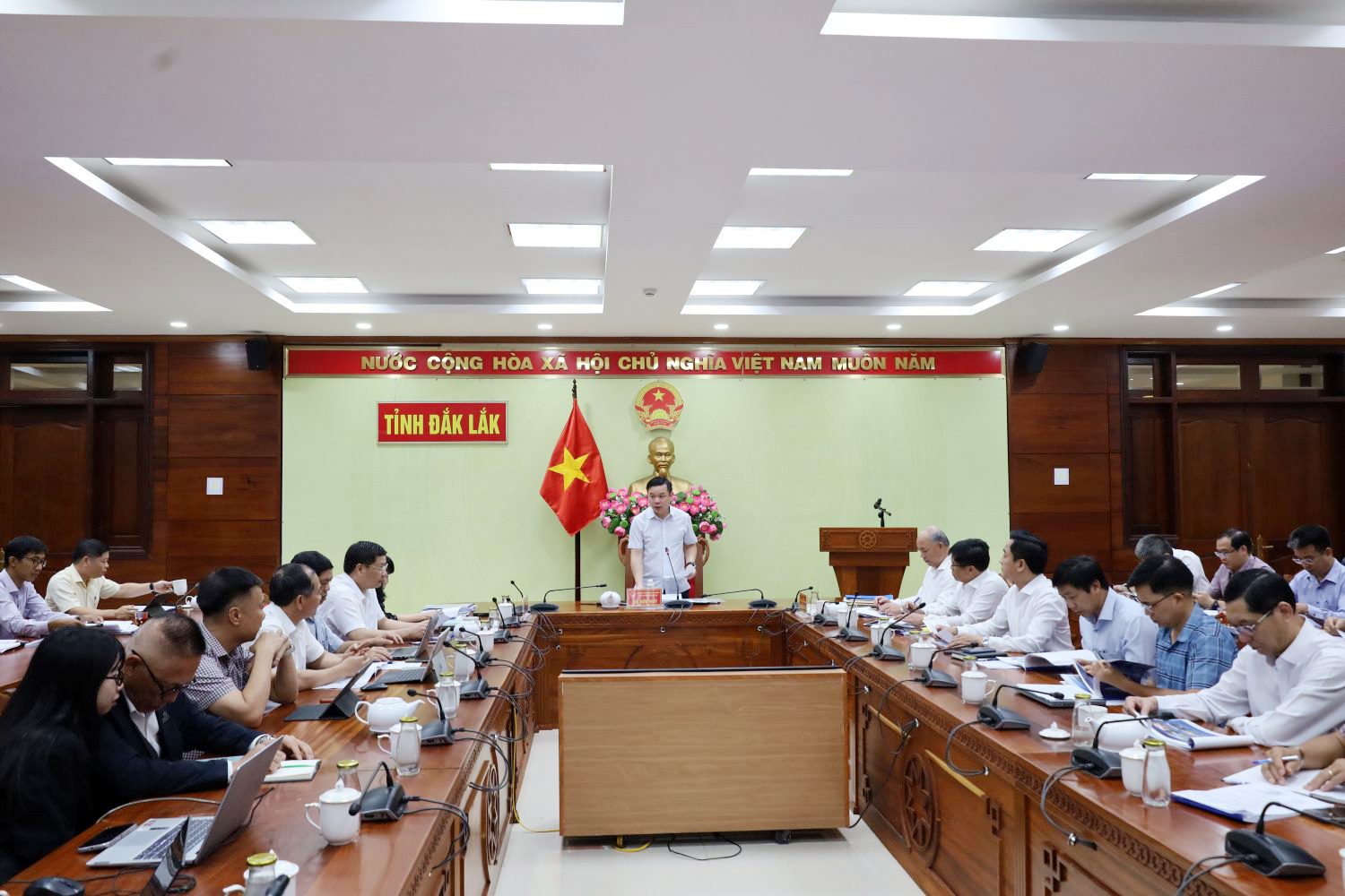 Sáng 8/4, UBND tỉnh Đắk Lắk tổ chức cuộc họp để nghe báo cáo về tình hình triển khai công tác lập điều chỉnh Quy hoạch chung đô thị Buôn Ma Thuột, tỉnh Đắk Lắk đến năm 2050. Đồng chí Đỗ Hữu Huy - Ủy viên Dự khuyết Ban Chấp hành Trung ương Đảng, Phó Bí thư Tỉnh ủy, Chủ tịch UBND tỉnh chủ trì hội nghị.