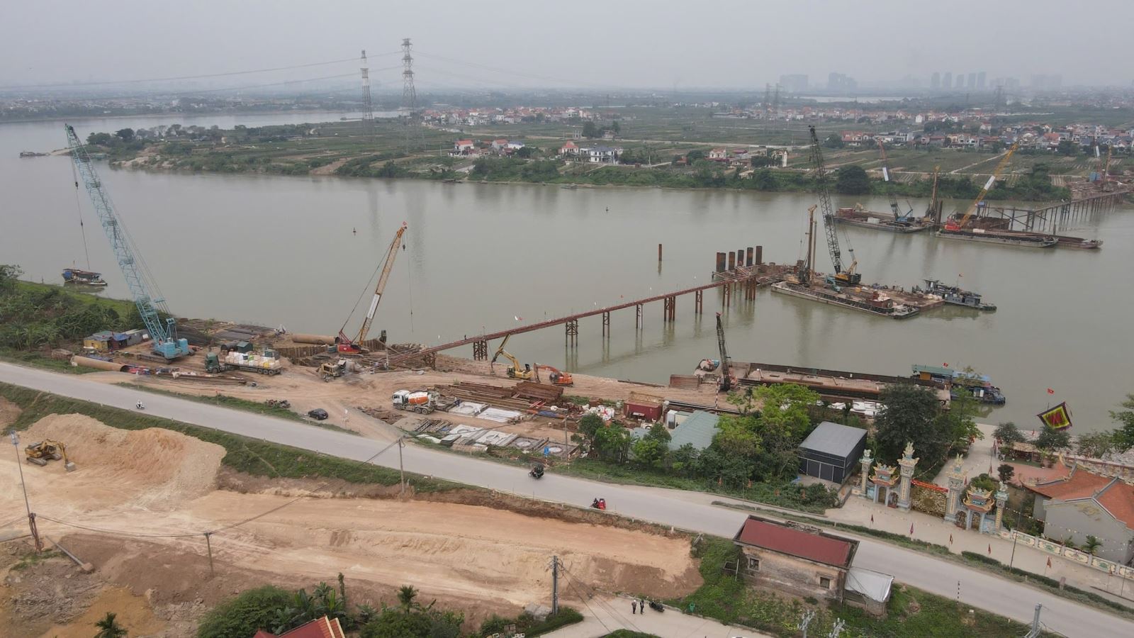 Hiện tại, không khí thi công tại từng hạng mục dự án đều rất sôi động. Tại dự án xây dựng cầu Hồng Hà (có chiều dài hơn 4,37 km, điểm đầu tuyến tại xã Mê Linh, điểm cuối tuyến tại xã Ô Diên), nhà thầu đang triển khai 30 mũi thi công trên toàn bộ mặt bằng đã được bàn giao. Đến nay, các nhà thầu đã hoàn thành 760/941 cọc khoan nhồi; 22/70 bệ trụ; thi công cọc ván thép và hố móng của 37/70 trụ; hoàn thành 19/450 dầm Super T…
