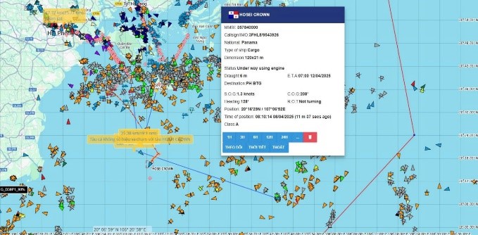 Cụ thể: Hồi 06 giờ 55 phút ngày 08/4/2025, Trung tâm Phối hợp tìm kiếm, cứu nạn hàng hải Việt Nam (Trung tâm) nhận thông tin: Tàu HOSEI CROWN (Quốc tịch Panama, Callsign: 3FHL8, IMO: 9543926; dài 120m; rộng 21m) trên đường hành trình từ cảng Chùa Vẽ, Hải Phòng đi Philippines đến vị trí 20-21N; 107-05E (cách phao số 0 luồng Hải Phòng khoảng 20 lý về phía Nam, cách đảo Bạch Long Vĩ khoảng 45 hải lý về phía Tây Bắc) đâm va với tàu cá TH 92686TS làm tàu cá bị chìm, 12 thuyền viên mất tích; Thời tiết tại khu vực có gió Đông Nam cấp 3-4, biển có sương mù.