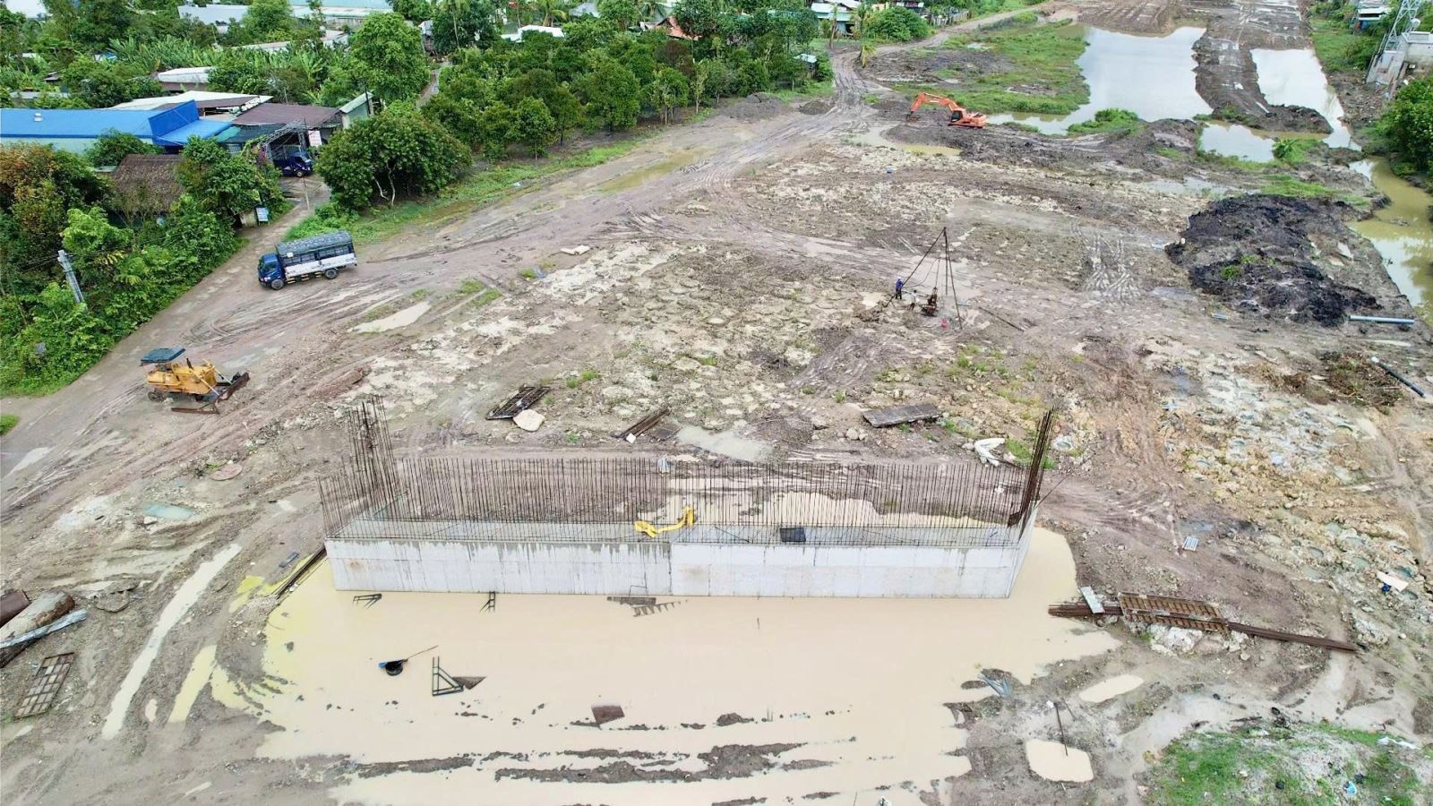 Mưa nước đọng thành từng vũng lớn ảnh hưởng đến việc thi công cao tốc qua Đồng Nai.