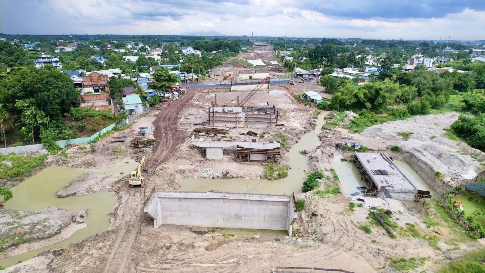Ông Nguyễn Công Giang, Phó tổng giám đốc công ty cho biết: "Chúng tôi đã hoàn tất khoan cọc hai cây cầu, còn một cầu gần khu công nghiệp Long Đức chỉ còn vài cọc nữa. Mưa nhỏ thì anh em cố làm cho được việc, nhưng mưa lớn thì phải dừng hẳn. Cứ tạnh là lao ra công trường ngay, vì không dám nghỉ quá lâu".