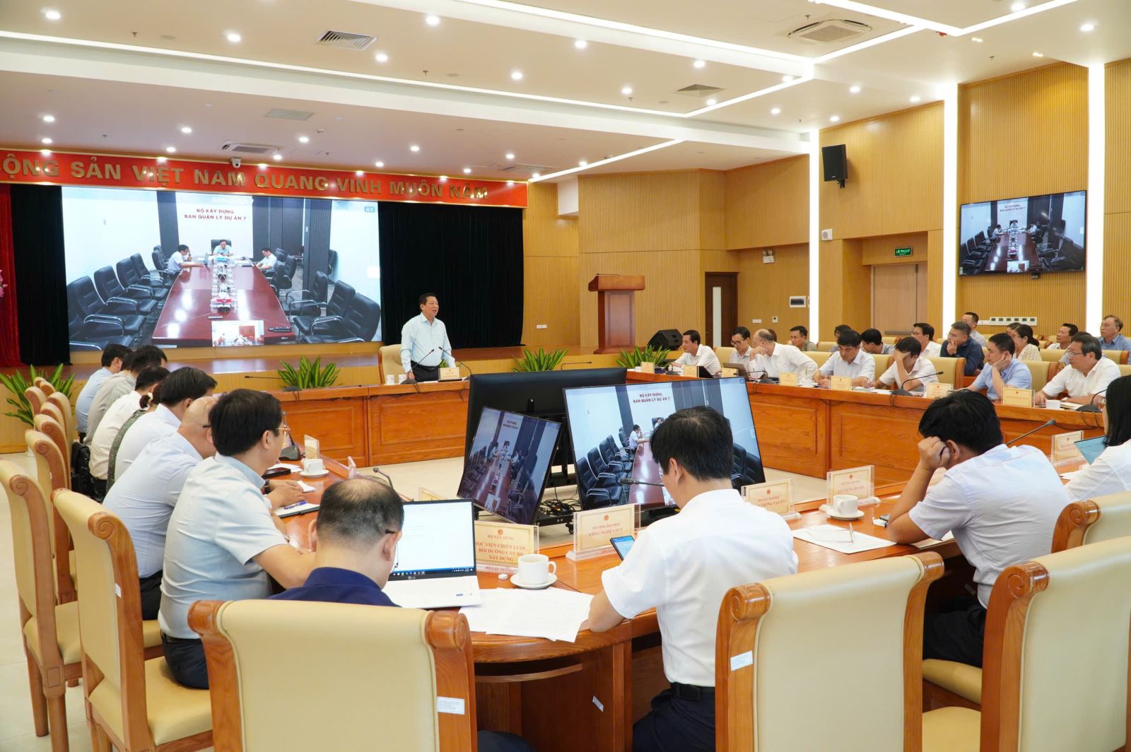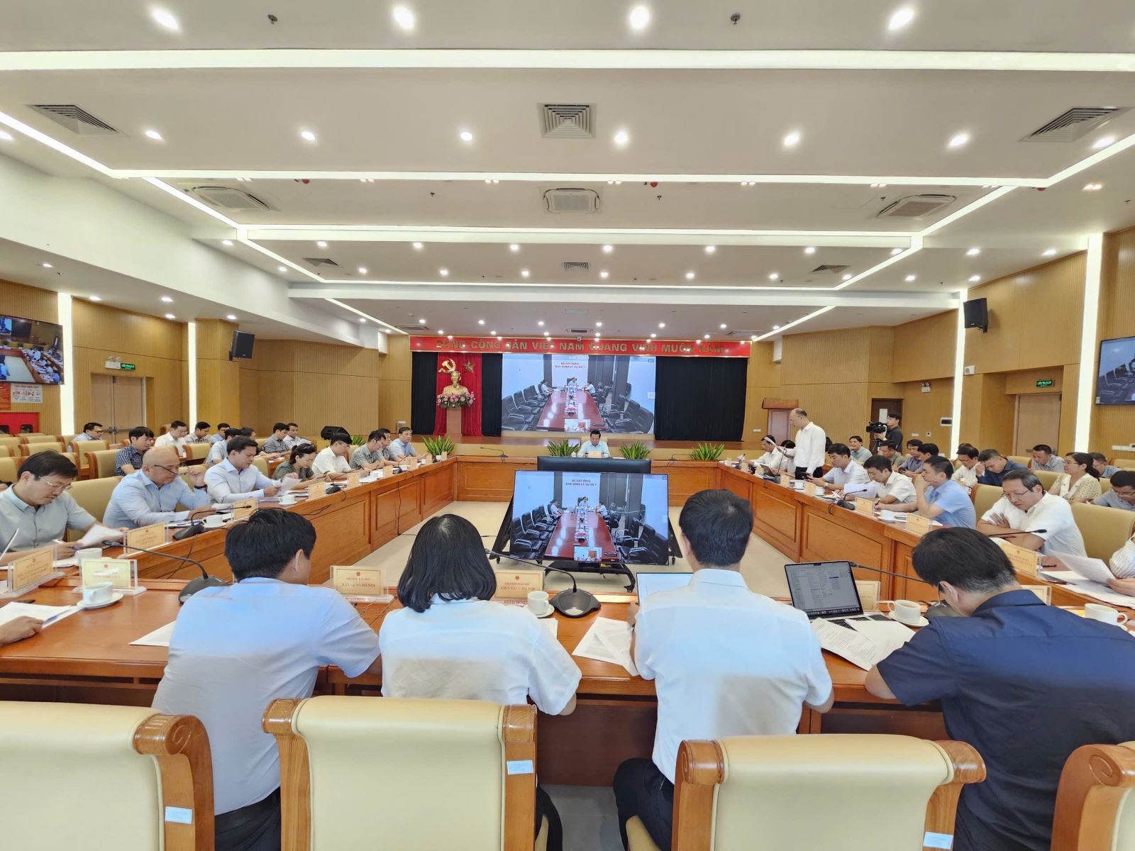 Cuộc họp về hoàn thiện hệ thống tiêu chuẩn, quy chuẩn và định mức, đơn giá, chỉ số giá xây dựng có sự tham gia của các cục, vụ, viện và Ban Quản lý dự án thuộc Bộ Xây dựng.