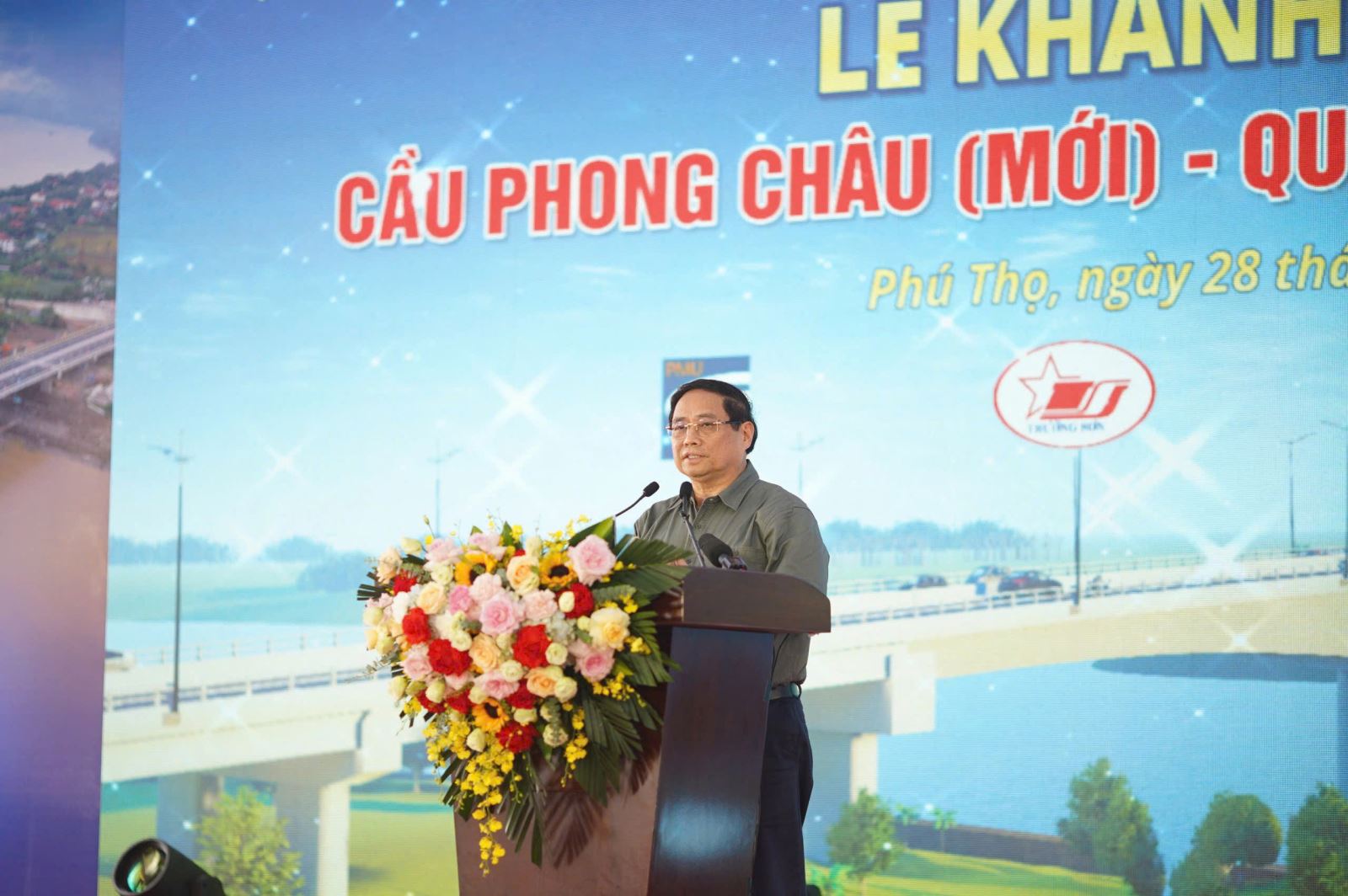 Phát biểu tại buổi Lễ, Thủ tướng Phạm Minh Chính cho biết, cách đây một năm, cầu Phong Châu cũ bị sập, cắt đôi tuyến đường huyết mạch.