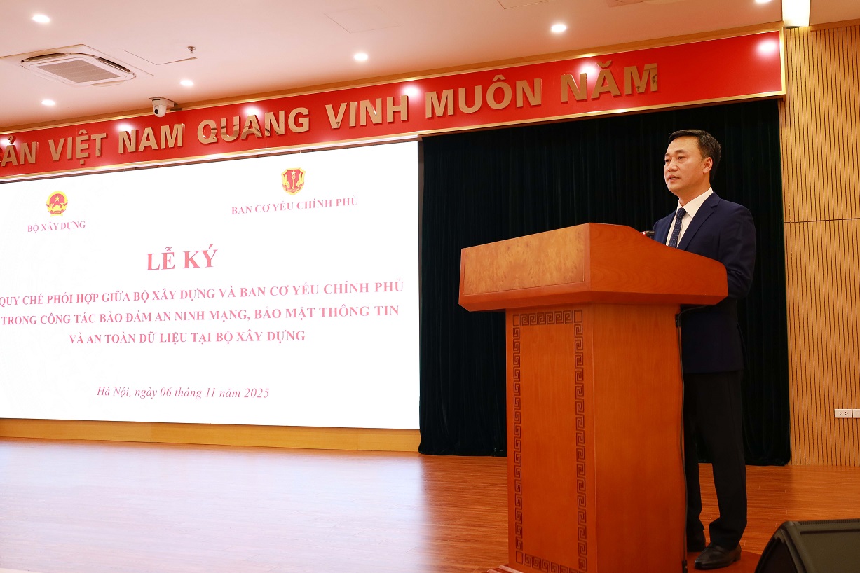 Thứ trưởng Bộ Xây dựng Nguyễn Việt Hùng nhấn mạnh ý nghĩa của việc ký kết Quy chế phối hợp trong bảo đảm an toàn thông tin, an ninh mạng của Bộ Xây dựng