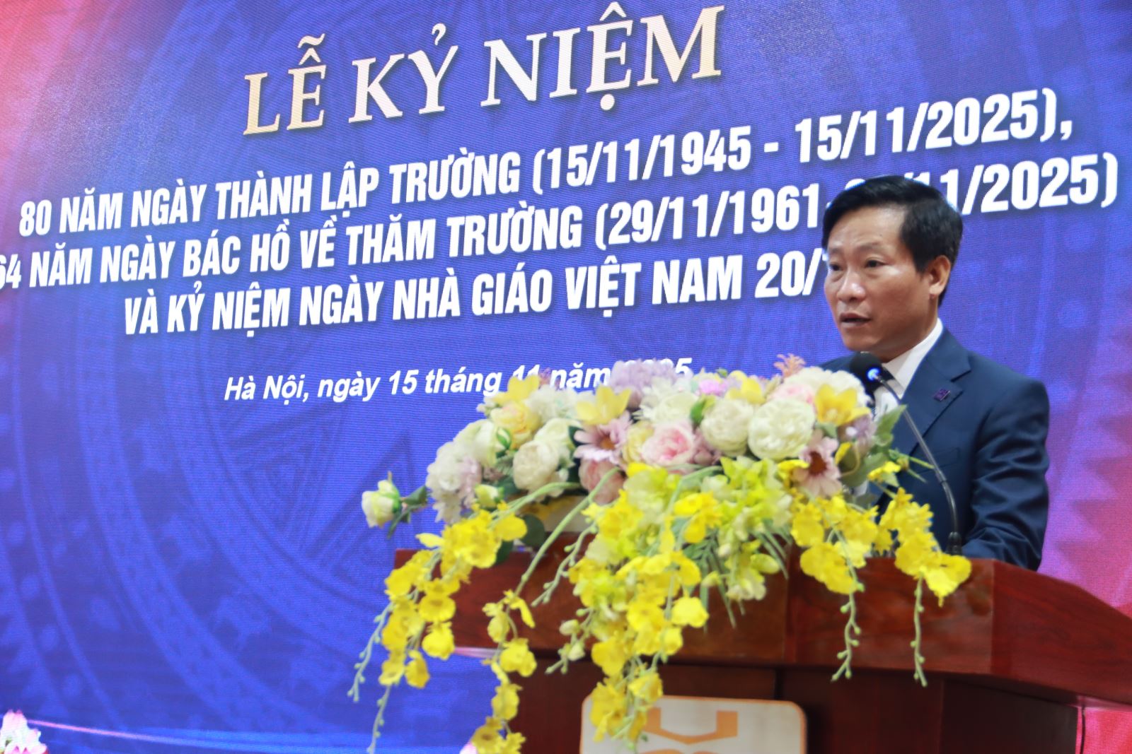 Kết thúc bài phát biểu, Hiệu trưởng Nguyễn Hoàng Long gửi lời chúc mừng Ngày Nhà giáo Việt Nam 20/11, đồng thời kêu gọi toàn thể cán bộ, giảng viên, sinh viên tiếp tục phát huy truyền thống 80 năm vẻ vang, đóng góp vào sự phát triển của Nhà trường và sự nghiệp xây dựng đất nước.