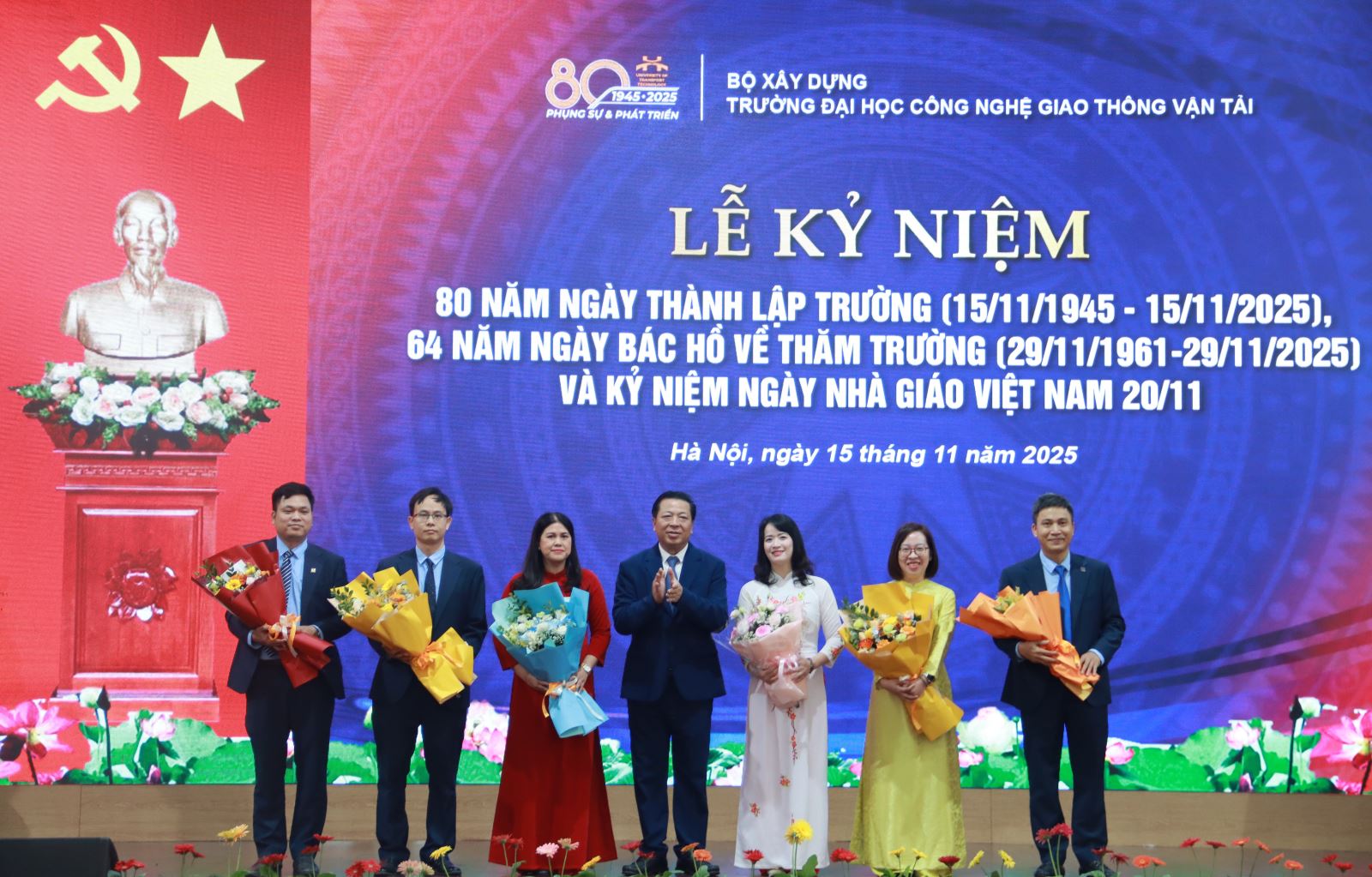 Trước đó, PGS. TS Nguyễn Hoàng Long, Hiệu trưởng Trường Đại học Công nghệ Giao thông vận tải tự hào ôn lại truyền thống 80 năm xây dựng và phát triển của Trường là hành trình gian lao nhưng rạng rỡ; được tạo dựng từ trí tuệ, tâm huyết và sự cống hiến của nhiều thế hệ thầy và trò Nhà trường.