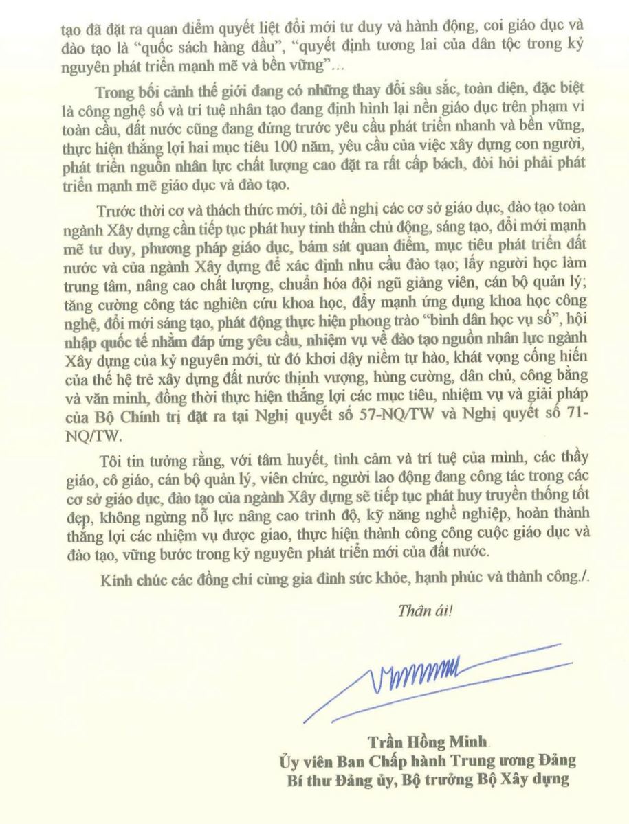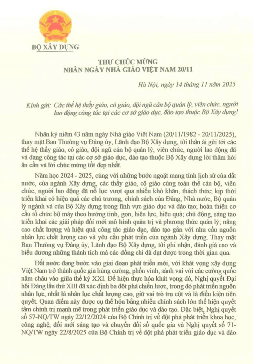 Nhân kỷ niệm 43 năm ngày Nhà giáo Việt Nam (20/11/1982 - 20/11/2025), Bộ trưởng Bộ Xây dựng Trần Hồng Minh đã thay mặt Ban Thường vụ Đảng ủy, Lãnh đạo Bộ Xây dựng gửi Thư chúc mừng tới các thế hệ Thầy giáo, Cô giáo, đội ngũ cán bộ quản lý, viên chức, người lao động công tác tại các cơ sở giáo dục, đào tạo thuộc Bộ Xây dựng.