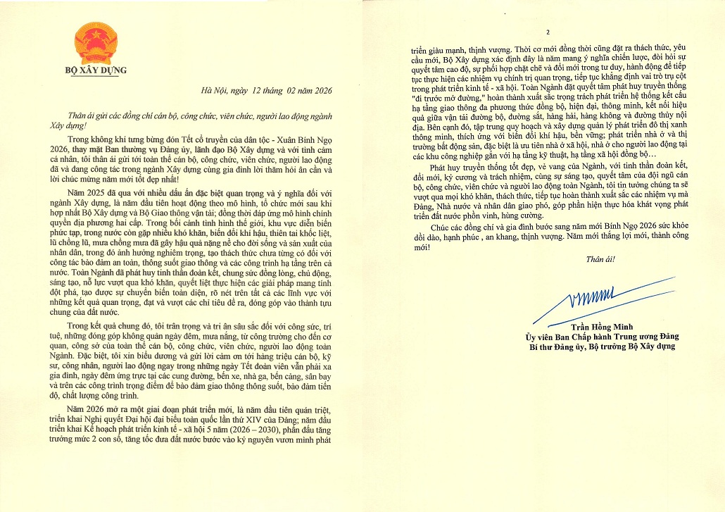 Nhân dịp năm mới 2026 và đón Xuân Bính Ngọ, Bộ trưởng Bộ Xây dựng Trần Hồng Minh đã gửi thư chúc Tết cán bộ, công chức, viên chức, người lao động ngành Xây dựng. Cổng Thông tin điện tử Bộ Xây dựng xin trân trọng đăng toàn văn Thư của Bộ trưởng Trần Hồng Minh.