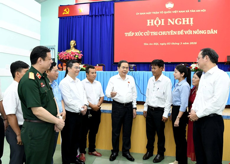 Chủ tịch Quốc hội Trần Thanh Mẫn trò chuyện với nông dân tại cuộc tiếp xúc cử tri ở Thành phố Hồ Chí Minh. (Ảnh: Lâm Hiển)