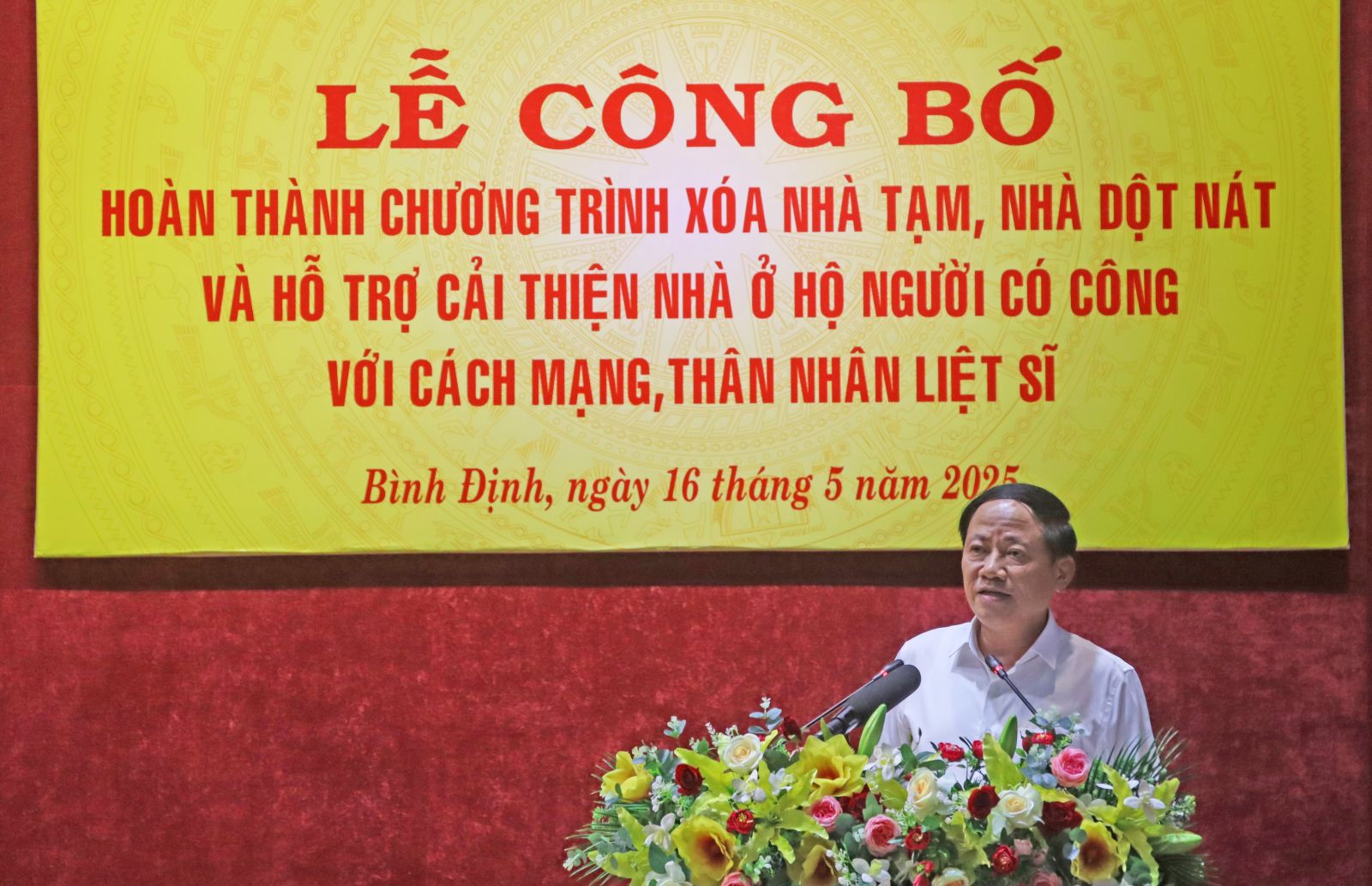 Phát biểu tại buổi lễ, Bí thư Tỉnh uỷ Hồ Quốc Dũng khẳng định, lễ công bố tỉnh Bình Định hoàn thành chương trình xoá nhà tạm, nhà dột nát và hỗ trợ cải thiện nhà ở hộ người có công với cách mạng, thân nhân liệt sĩ là dấu mốc có ý nghĩa chính trị, xã hội, nhân văn sâu sắc, là điểm sáng trong công tác an sinh xã hội của tỉnh. Đây là kết quả của sự quyết tâm, nỗ lực cao của Đảng bộ, chính quyền, nhân dân trong tỉnh, là minh chứng sống động cho tinh thần tương thân, tương ái của dân tộc Việt Nam.