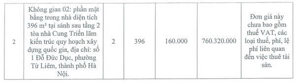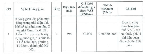 Viện Quy hoạch đô thị và nông thôn quốc gia thông báo giá khởi điểm đấu giá cho thuê mặt bằng (là phần mặt bằng 02 sảnh phía sau tầng 2) tại Tòa nhà Cung Triển lãm kiến trúc quy hoạch xây dựng quốc gia, địa chỉ: số 1 Đỗ Đức Dục, phường Từ Liêm, thành phố Hà Nội, như sau: