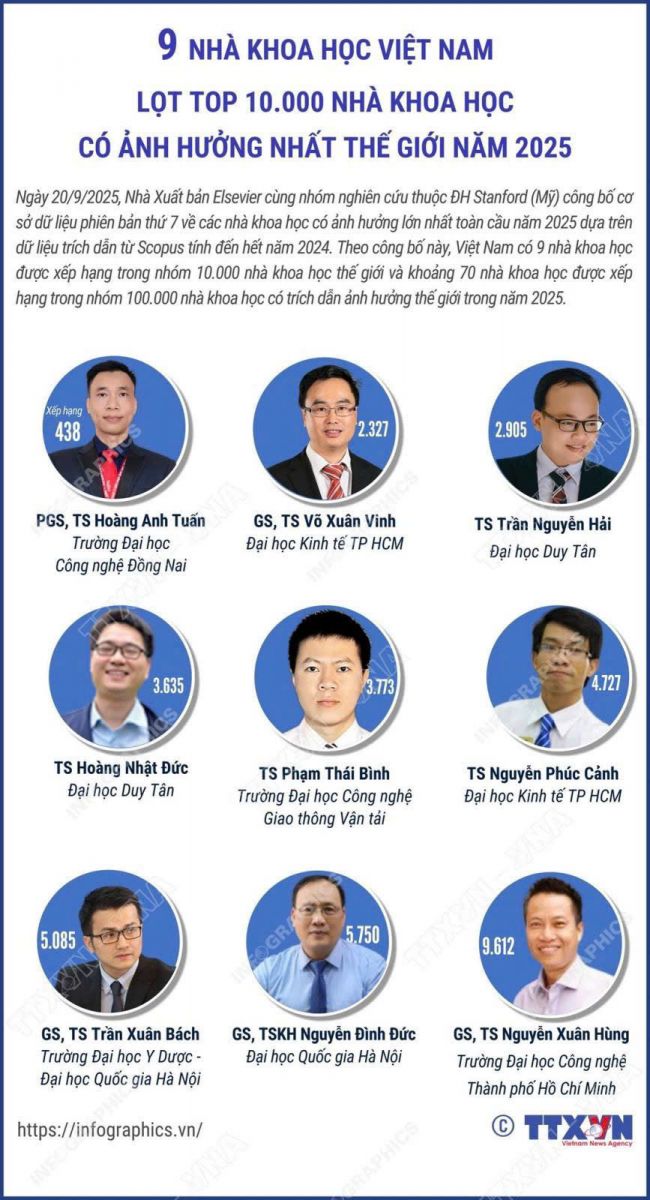 Danh sách 9 nhà khoa học được xếp hạng trong nhóm 10.000 nhà khoa học có tầm ảnh hưởng nhất thế giới năm 2025. (Ảnh: Thông tấn xã Việt Nam)