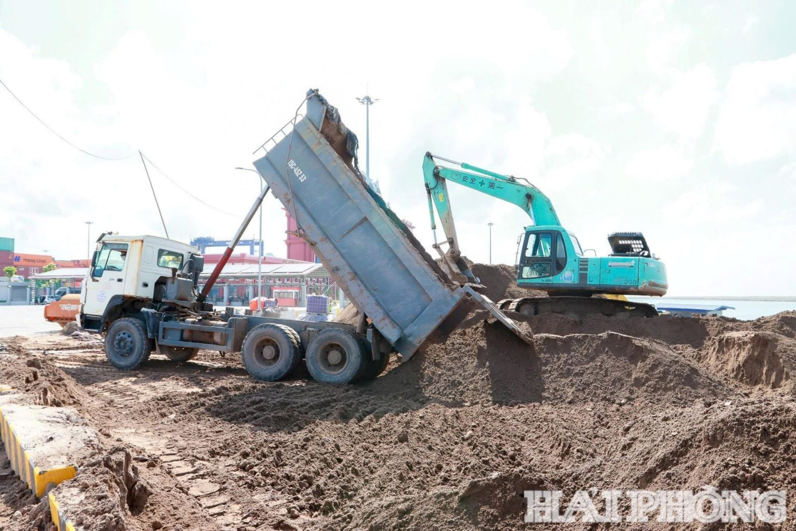Các nhà thầu huy động thiết bị, phương tiện đẩy nhanh tiến độ thi công tuyến đường sau bến số 3 đến số 6 khu bến cảng Lạch Huyện.
