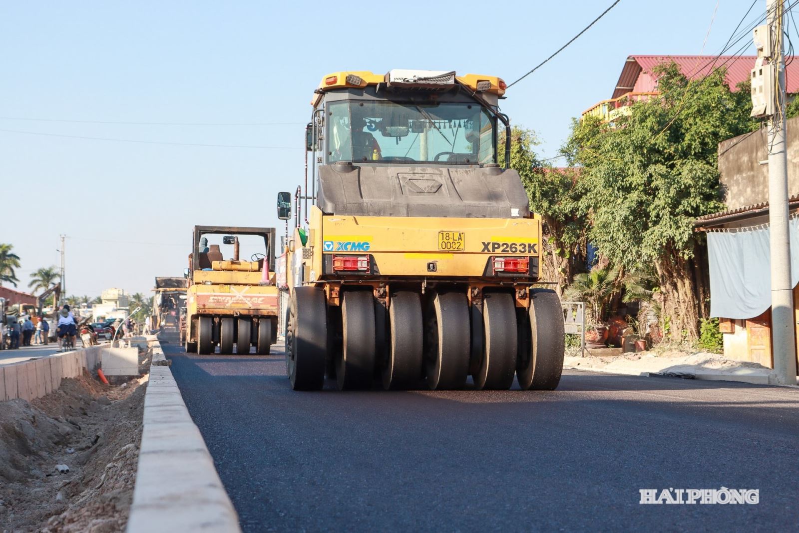 Ngày 14/11, tại khu vực thi công đoạn đường ở xã Vĩnh Am (thành phố Hải Phòng), nhà thầu thi công là Công ty TNHH Phát triển Xuân Thành đang thảm lớp nhựa hoàn thiện mặt đường, hàng chục công nhân với nhiều phương tiện cơ giới tập trung thi công.