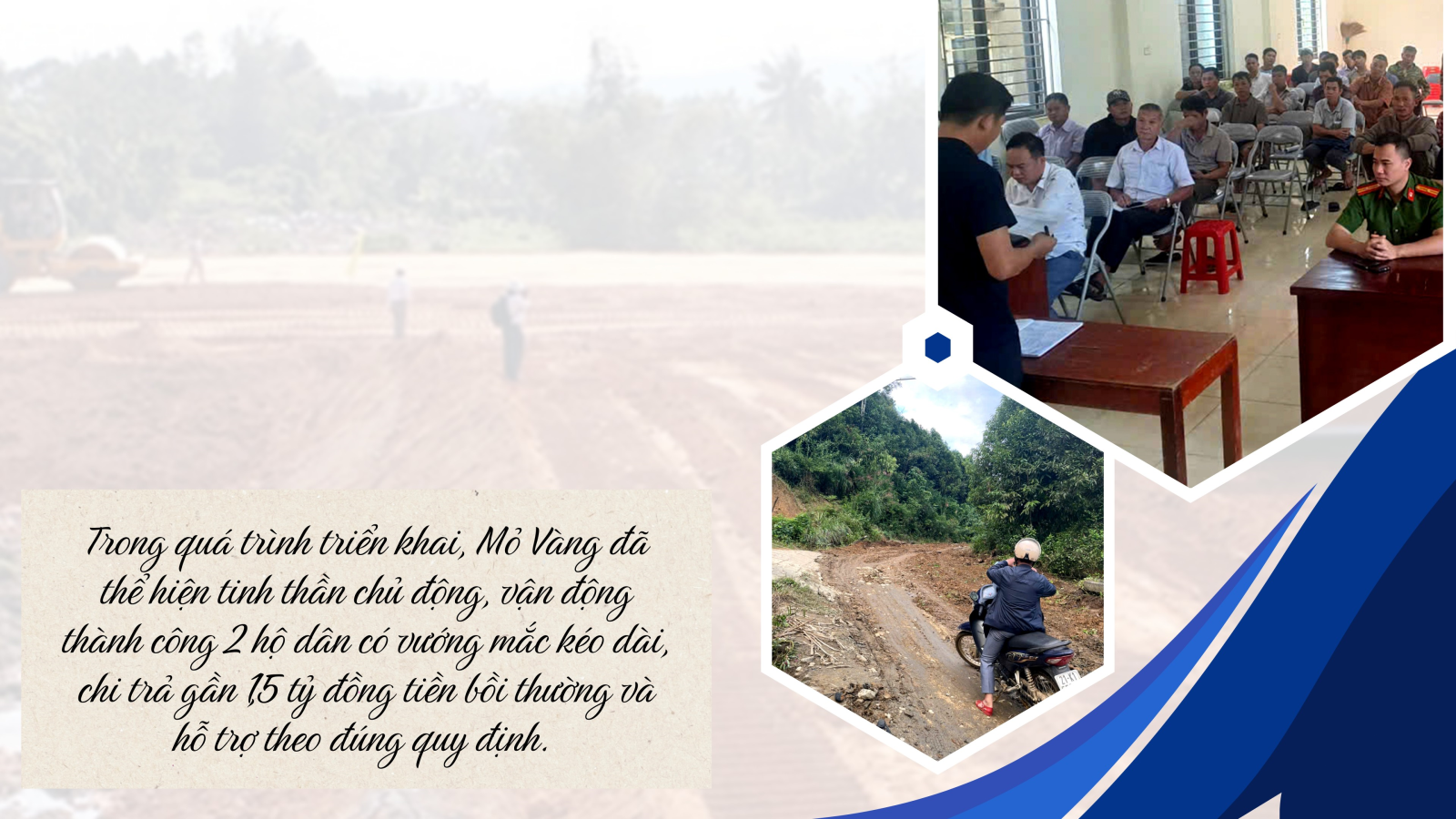 Trong quá trình triển khai, Mỏ Vàng đã thể hiện tinh thần chủ động, vận động thành công 2 hộ dân có vướng mắc kéo dài, chi trả gần 1,5 tỷ đồng tiền bồi thường và hỗ trợ theo đúng quy định. Xã phối hợp với các cơ quan chuyên môn hoàn thành xác nhận nguồn gốc đất cho 37 hộ dân. 24 hộ còn lại đang khẩn trương hoàn thiện hồ sơ.