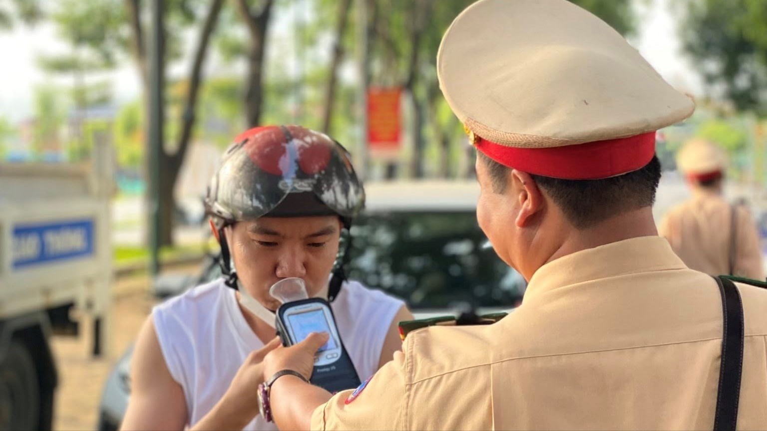 Đội Cảnh sát giao thông đường bộ số 4, Công an tỉnh Lào Cai kiểm tra nồng độ cồn người tham gia giao thông.