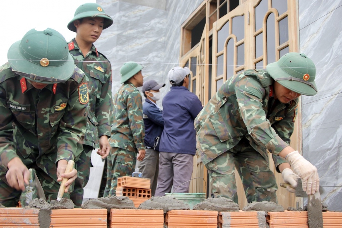 Cán bộ, chiến sĩ Quân đoàn 34 xây tường bao cổng cho gia đình bà Định, để cả nhà và sân cổng cùng được hoàn thiện.