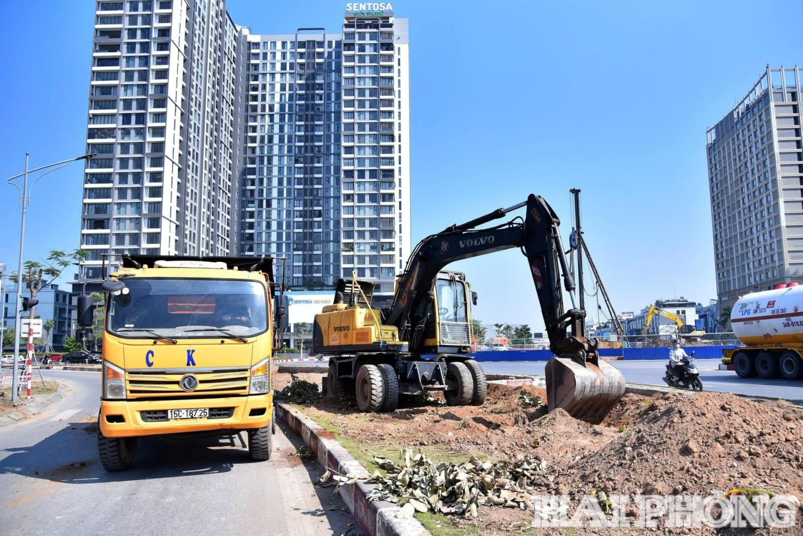 Sau khi dọn dẹp mặt bằng toàn bộ vòng xuyến nút giao Bùi Viện - Lê Hồng Phong, đơn vị quây rào tôn để bảo đảm an toàn giao thông và huy động máy móc thiết bị bóc dỡ lớp đất mặt, di chuyển hệ thống công trình ngầm và triển khai dây chuyền thi công cọc xi măng đất, xử lý nền đất yếu.