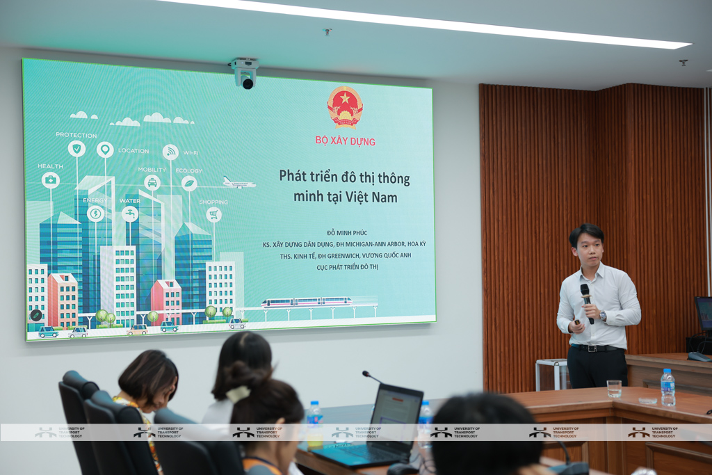 Ông Đỗ Minh Phúc - đại diện Cục Phát triển đô thị (Bộ Xây dựng) đã trình bày báo cáo về phát triển đô thị thông minh tại Việt Nam. Qua đó làm nổi bật vai trò của công nghệ số trong quy hoạch, xây dựng và quản lý hạ tầng đô thị hiện đại. Báo cáo làm rõ khái niệm đô thị thông minh dựa trên ba trụ cột chính: công nghệ, dữ liệu và con người, đồng thời hệ thống hóa quá trình triển khai từ các đề án thí điểm đến việc hoàn thiện khung pháp lý quốc gia, đặc biệt với các chính sách như Nghị định về phát triển đô thị thông minh.