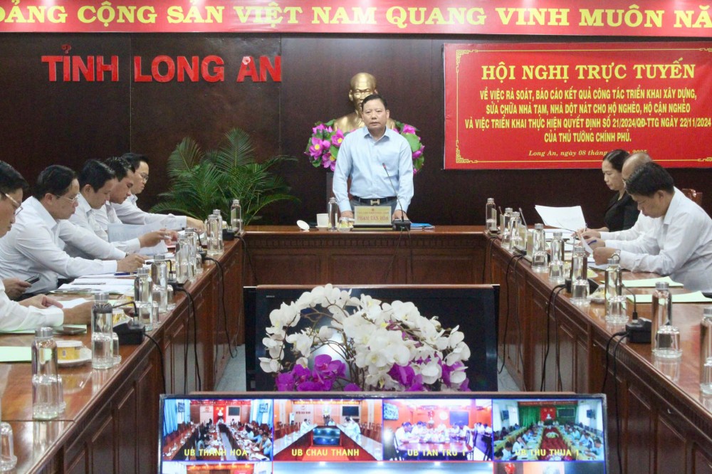 Phó Chủ tịch UBND tỉnh Long An - Phạm Tấn Hòa vừa chủ trì Hội nghị trực tuyến về việc rà soát, báo cáo kết quả công tác triển khai xây dựng, sửa chữa nhà tạm, nhà dột nát cho hộ nghèo, hộ cận nghèo và việc triển khai thực hiện Quyết định số 21/2024/QĐ-TTg ngày 22/11/2024 của Thủ tướng Chính phủ.