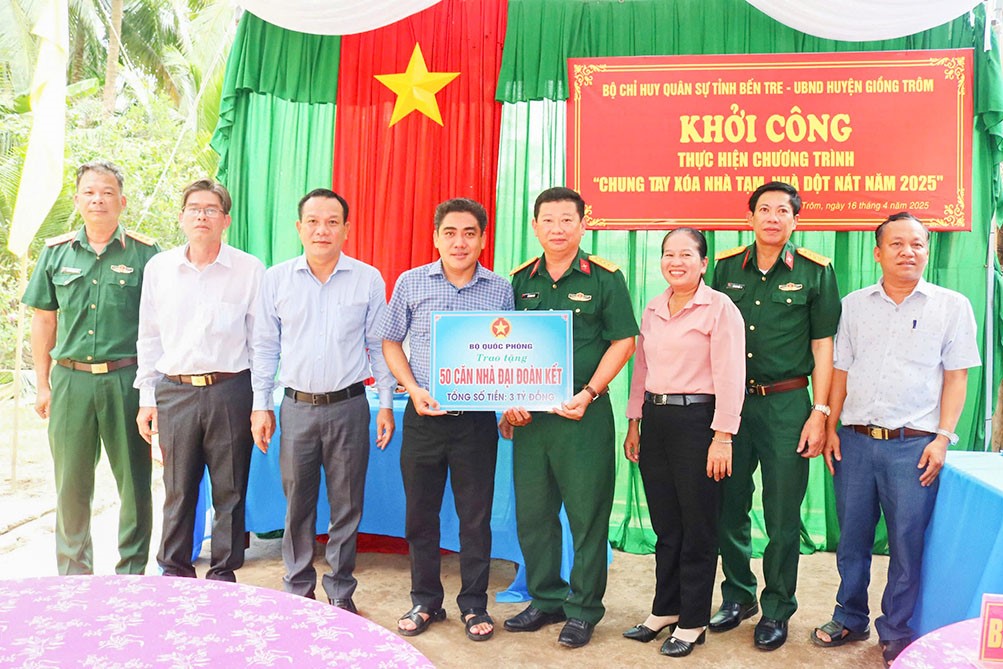 UBND huyện Giồng Trôm, tỉnh Bến Tre vừa phối hợp với Bộ Chỉ huy Quân sự tỉnh tổ chức khởi công thực hiện chương trình “Chung tay xóa nhà tạm, nhà dột nát năm 2025”. Đây là công trình trong chuỗi các hoạt động chào mừng kỷ niệm 50 năm Ngày giải phóng miền Nam, thống nhất đất nước (30/4/1975-30/4/2025).