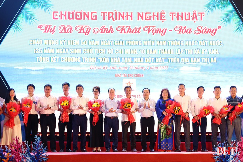 Lãnh đạo tỉnh và thị xã Kỳ Anh tặng hoa cảm ơn các doanh nghiệp, nhà hảo tâm đã đồng hành, ủng hộ nguồn lực cho chương trình xóa nhà tạm, nhà dột nát trên địa bàn