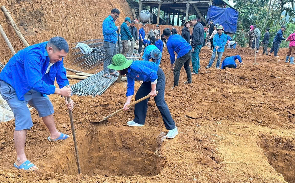 Các tổ chức hội, đoàn thể huyện Văn Chấn tham gia ngày công lao động giúp hộ nghèo vùng cao đào móng nhà.