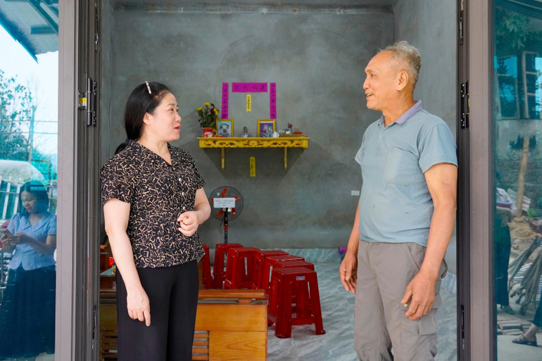 Bà Đỗ Thị Minh Hoa, Ủy viên Ban Thường vụ Tỉnh ủy, Chủ tịch Ủy ban MTTQ Việt Nam tỉnh Bắc Kạn đến thăm, chúc mừng gia đình cựu chiến binh Nông Văn Roéng, thôn An Phát, xã Thanh Mai (Chợ Mới) vừa xây xong nhà kiên cố.