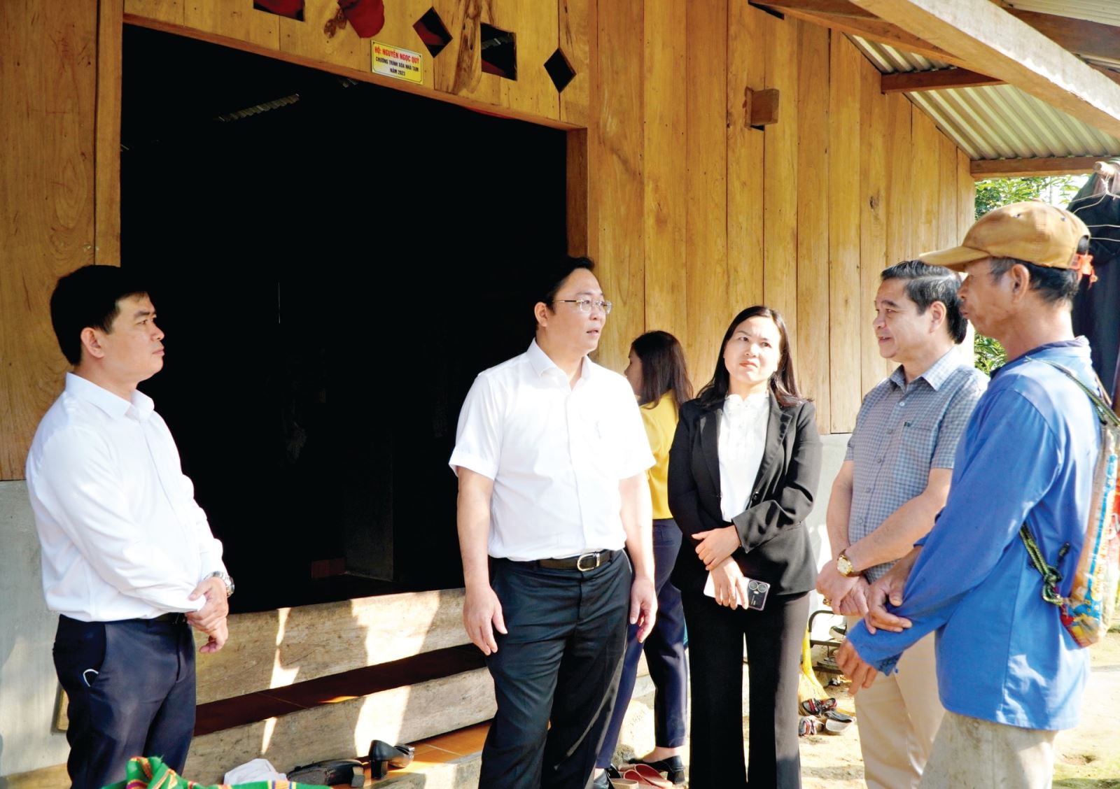 Chủ tịch Ủy ban MTTQ Việt Nam thành phố Lê Trí Thanh (thứ 2, từ trái sang) thăm một hộ dân ở huyện Nam Trà My (cũ) đã hoàn thành xóa nhà tạm