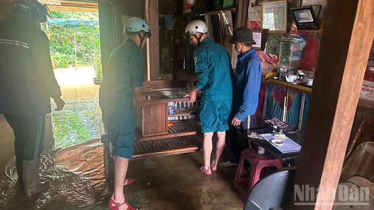Lực lượng dân quân Phường 3 Bảo Lộc, tỉnh Lâm Đồng hỗ trợ các hộ dân có nhà bị ngập di chuyển đồ đạc, tài sản đến nơi an toàn