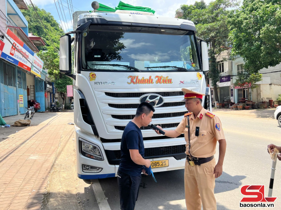 Cảnh sát giao thông Công an tỉnh Sơn La kiểm tra kích cỡ thùng, thành phương tiện giao thông.