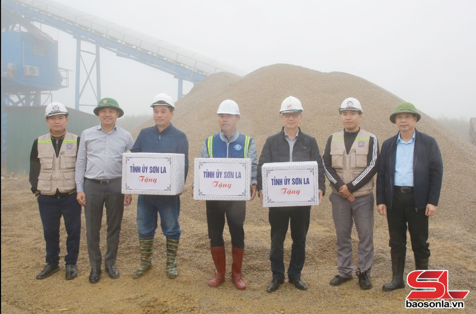 Đồng chí Bí thư Tỉnh uỷ Sơn La và đoàn công tác tặng quà cho các đơn vị thi công.